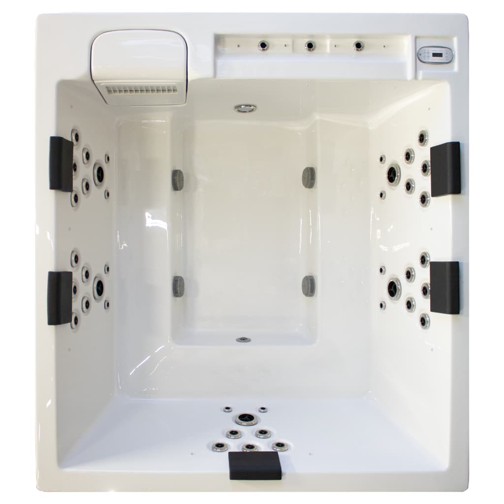 Ett stilrent spabad med fem platser med massagejets och fler platser för avkoppling. Med loungeliknande sittplatser skapas flytande gränser var sittplatserna börjar och slutar och ger plats till fler. Spabadet har en stor lampa, vattennivåbelysning och ett belyst fontänvattenfall som ger ett härligt sken.